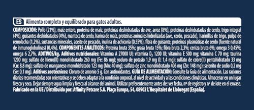 La composición del pienso incluye ingredientes de alta calidad como pollo (21%), maíz, y arroz (8%), asegurando una dieta equilibrada. Las proteínas animales hidrolizadas y deshidratadas, junto con el aceite de pescado, contribuyen a una nutrición completa. Además, las inmunoglobulinas activas y los polifenoles naturales ayudan a mantener la salud intestinal y retrasar el envejecimiento celular.