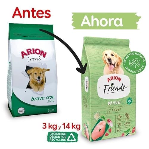 Arion Friends pienso para perros adultos con pollo y arroz, altamente nutritivo y digestible, enriquecido con Omega 3 y 6.