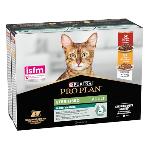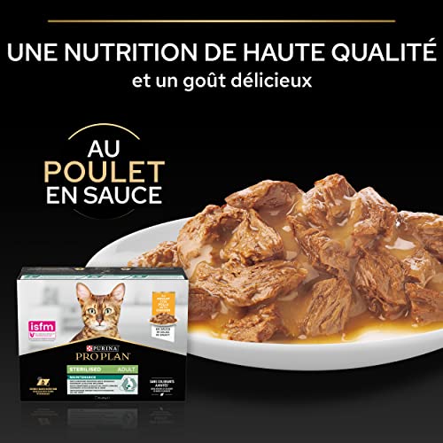 Purina Pro Plan – Comida húmeda para gatos adultos esterilizados, sabor pollo y buey en salsa, pack de 10 latas. Fórmula para un tracto urinario saludable y control de peso.