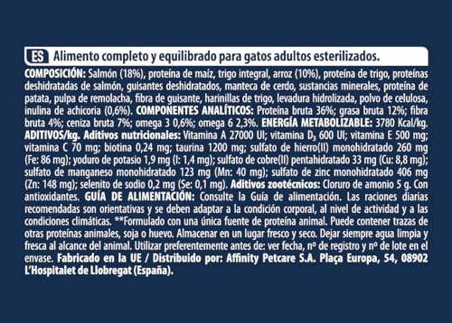 Este pienso se destaca por su fórmula innovadora que combina salmón, una fuente rica en proteínas, con cebada, un ingrediente que favorece la digestión. Juntos, estos componentes trabajan para promover un peso saludable y prevenir los problemas digestivos comunes en los gatos esterilizados.