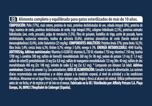 Pienso Advance Sterilized +10, formulado para gatos senior esterilizados, con pollo de alta calidad, promueve salud y vitalidad.