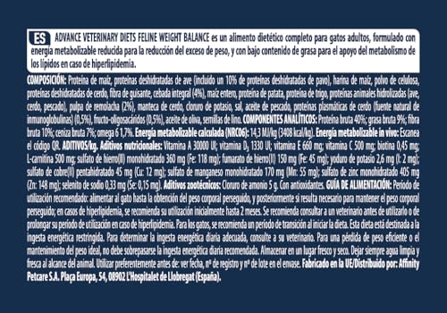 Especificaciones: Advance Veterinary Diets – Pienso para gatos adultos Advance Weight Balance Dietas Veterinarias. 8 Kg
