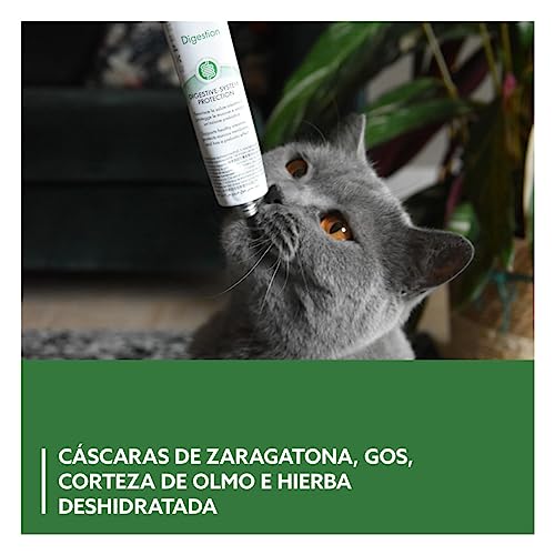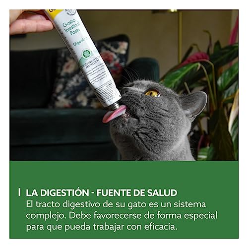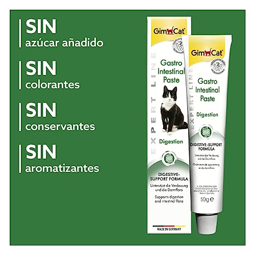 La Pasta Gastro-Intestinal GimCat es un complemento alimenticio que mejora la salud intestinal de los gatos mediante ingredientes naturales como la zaragatona y el TGOS.