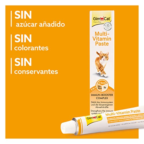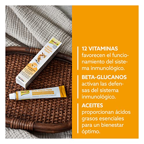 La Pasta Multivitaminada GimCat es un complemento alimenticio para gatos que mejora el sistema inmunitario con 12 vitaminas esenciales y aceite de lino.