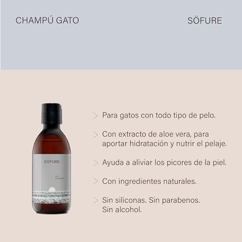 Champú Söfure para gatos con aloe vera, ideal para hidratar y aliviar picores en la piel. Sin silicona, parabenos ni alcohol.