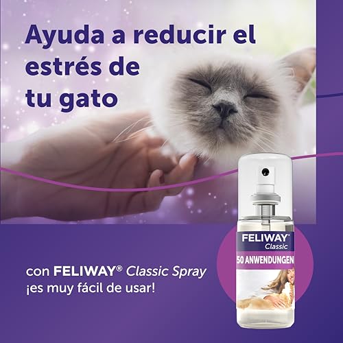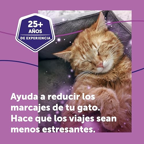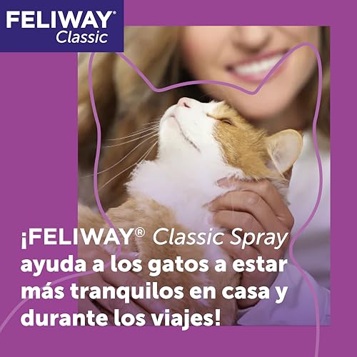 El Spray tranquilizador Feliway para gatos de 60 ml reduce el estrés y la ansiedad, proporcionando un ambiente de calma. Ideal para uso en viajes, mudanzas y visitas al veterinario.