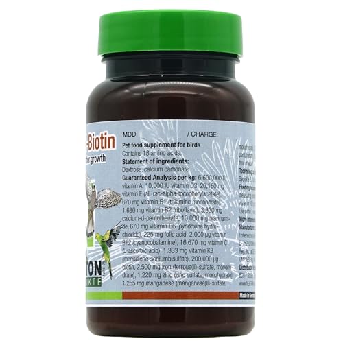 Nekton Biotin es más que un simple suplemento. Su fórmula avanzada incluye 6,600,000 UI de vitamina A, 10,000 UI de vitamina D3, y 20,160 mg de vitamina E, entre otros nutrientes esenciales, lo que lo convierte en un aliado poderoso para el bienestar de tus aves. Este suplemento no solo mejora el plumaje, sino que también contribuye al fortalecimiento general del sistema inmunológico y al bienestar integral de tus mascotas aladas.