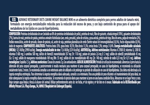 Advance Veterinary Diets Weight Balance Mini es un pienso para perros mini adultos, formulado para controlar el peso y mejorar el metabolismo lipídico.