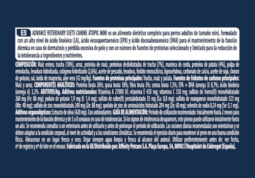 Advance Veterinary Diets Atopic Mini: solución nutricional para perros pequeños con problemas de piel, adecuada para cachorros y adultos.
