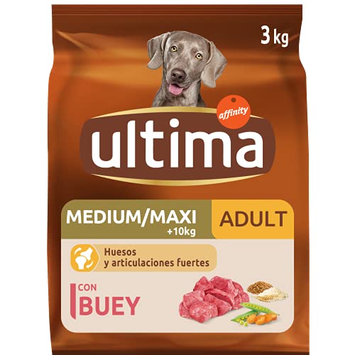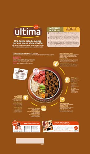 Ultima Medium-Maxi Buey es un pienso de alta calidad diseñado para perros medianos y grandes, ofreciendo carbohidratos de lenta absorción y proteínas esenciales.