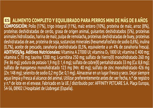 Pienso Ultima para perros senior minis, especialmente formulado para razas pequeñas mayores de 8 años, garantiza salud y vitalidad.