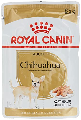 Comida húmeda Royal Canin para chihuahuas adultos, formulada para promover la salud intestinal y del pelo, con textura suave para facilitar la masticación.