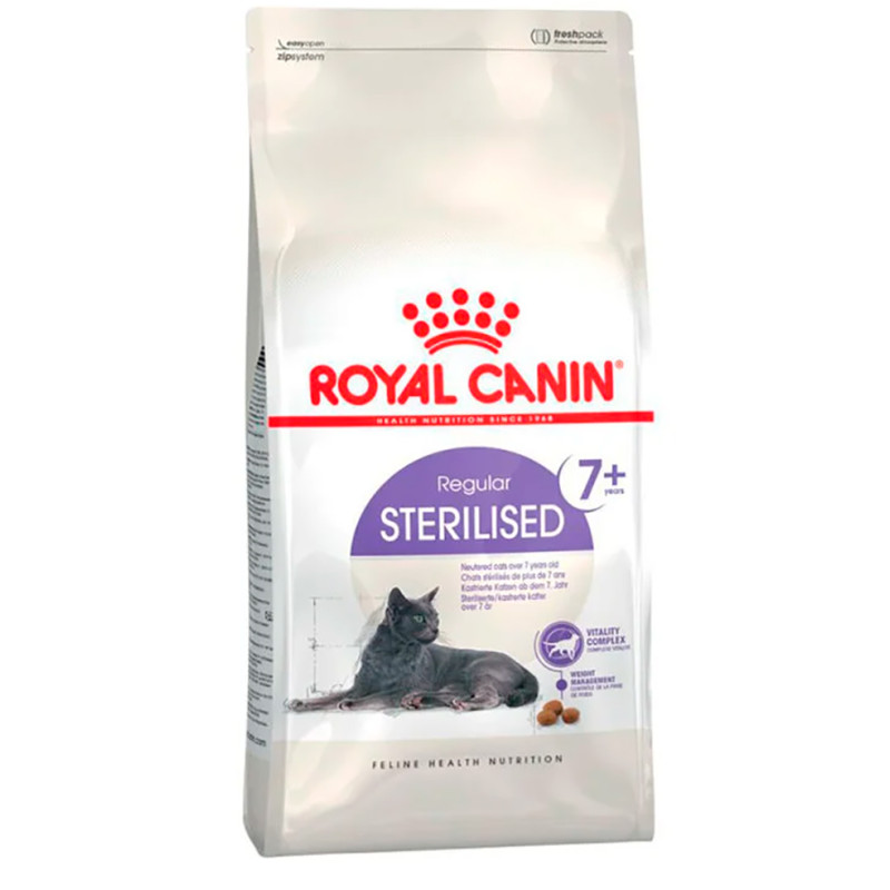 Royal Canin Sterilised 7+ es un pienso completo para gatos adultos y senior esterilizados, ayudando a mantener su vitalidad, peso ideal y salud renal.